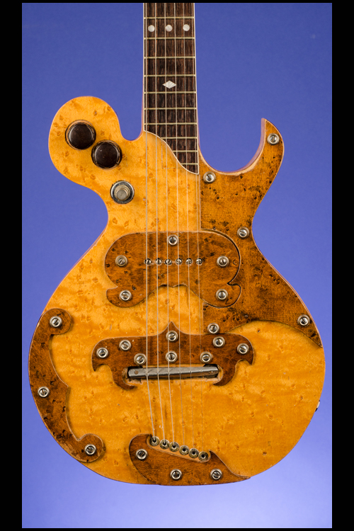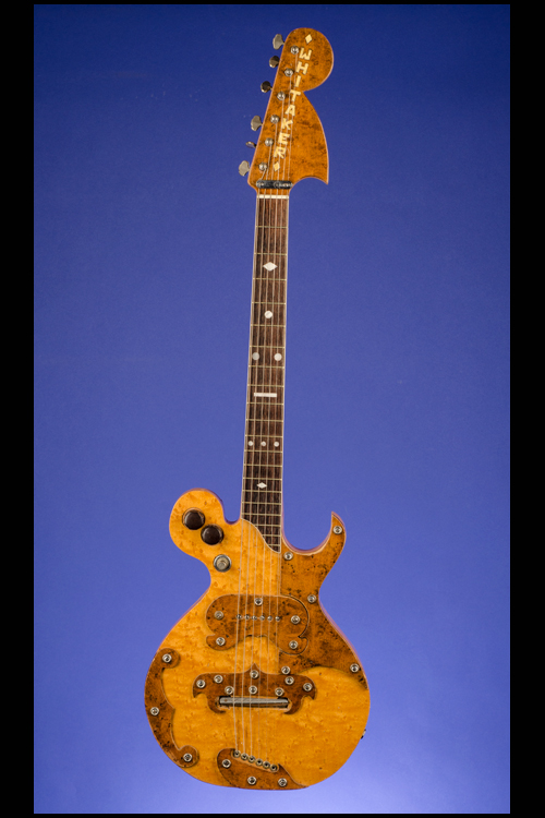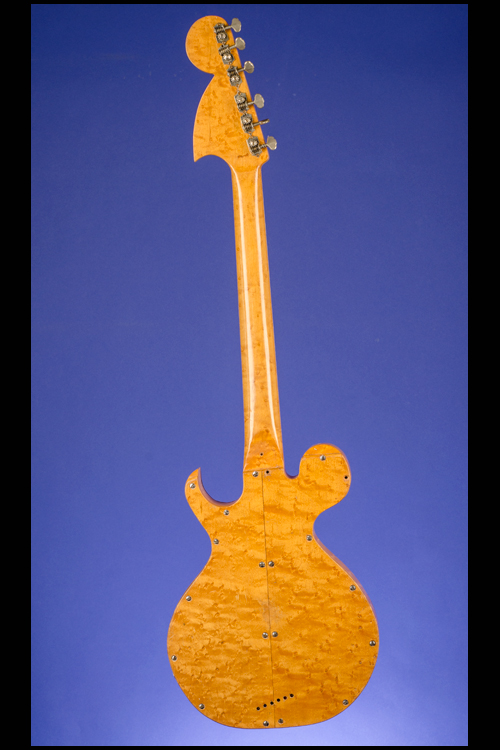 A remarkable handmade electric guitar by the little-known builder Whitaker, inspired by Paul Bigsby’s revolutionary late-1940s designs. Constructed of beautifully figured birds-eye maple with walnut overlays and neck-through body, this unique instrument combines sculptural craftsmanship with mechanical precision. Long mistaken for a genuine Bigsby and featured in 2000 Guitars: The Ultimate Collection (The Chinery Collection) on pp. 16-17 as the “1954 Bigsby Whitaker,” it was later re-identified by Bigsby expert Deke Dickerson as a superb independent tribute.