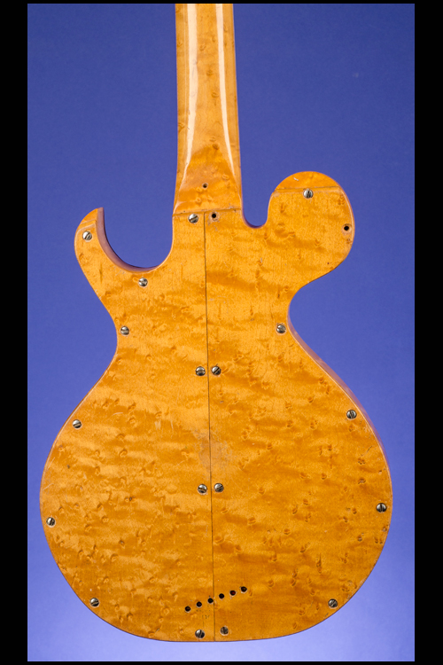 This mid-fifties Paul Bigsby influenced guitar weighs just 7.20 lbs., and features a neck through chambered birds-eye maple body with a two-piece birds-eye maple back, each side secured by ten slot-head screws. The top of the guitar has five, specifically shaped pieces of birds-eye walnut. These five pieces act as pickguard, pickup surround, bridge surround, tailpiece and bass-edge decoration. Each of these pieces is secured by three-to-eight slot-head screws. The birds-eye maple neck features the typical Bigsby-shaped headstock with six individual Grover open-back tuners with cloverleaf shaped metal buttons. The face of the headstock has a 1/8 inch veneer, the top of which is stained to match the five pieces on the body and has "WHITAKER" inlaid in mother-of-pearl with a diamond shape above and below. Aluminium string-tree covering all six strings and secured by two screws. Single-bound rosewood fretboard with a nut width of 1 5/8 inches, a scale length of 25 1/8 inches and a typical fifties thick neck profile. The fretboard has 20 medium-to-thin frets (the last three sloping away from the bass side) and inlaid mother-of-pearl 'Bigsby' style position markers of diamonds, circles and rectangles. One 'Gibson' syle single-coil pickup in the middle position with six individually adjustable pole-pieces and an output of 7.19k. Two controls (one volume, one tone) plus a two-way 'push' switch which activates and deactivates the tone control. Dark brown plastic 'octagonal' control knobs. Height-adjustable aluminium pre-compensated bridge. Through body stringing. Overall this very unusual guitar is in exceptionally fine (9.00) condition and more importantly it most certainly has a very unique sound. Housed in an eighties Gibson three-latch 'Protector' black hardshell case with purple plush lining (8.75).