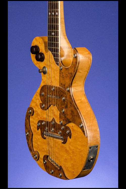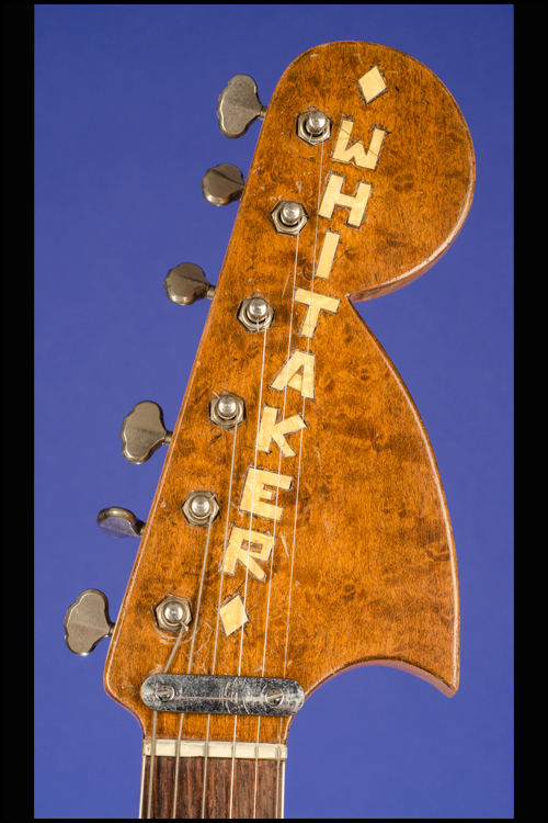 This guitar came from the world renowned collection of Scott Chinery. It was purchased by Chinery as an original mid-fifties Paul Bigsby guitar. Since that time it has been written about by Bigsby guitar expert Deke Dickerson… here is an extract from his 'The Bigsby Files' - "Bigsby -influenced guitar by Whitaker, 1950s. This thing floated around for a while and was bought by the Chinery Collection. Unfortunately, this homely guitar was featured in several magazines as a real Bigsby guitar. Here's a hint: if the headstock says Whitaker, it's probably a Whitaker, not a Bigsby. There's no doubting where the influence came from though, with it's birdseye maple top and contrasting walnut pickguard, and six-on-a-side headstock." (Deke Dickerson. The Bigsby Files).