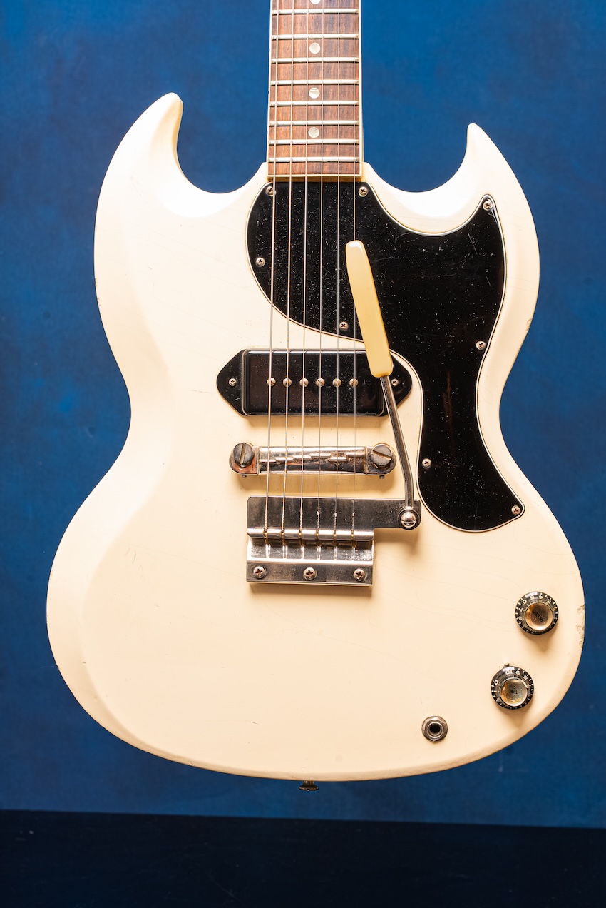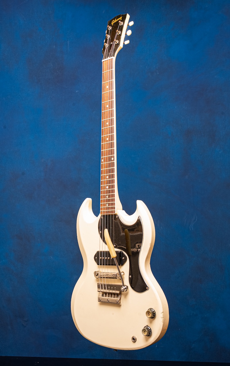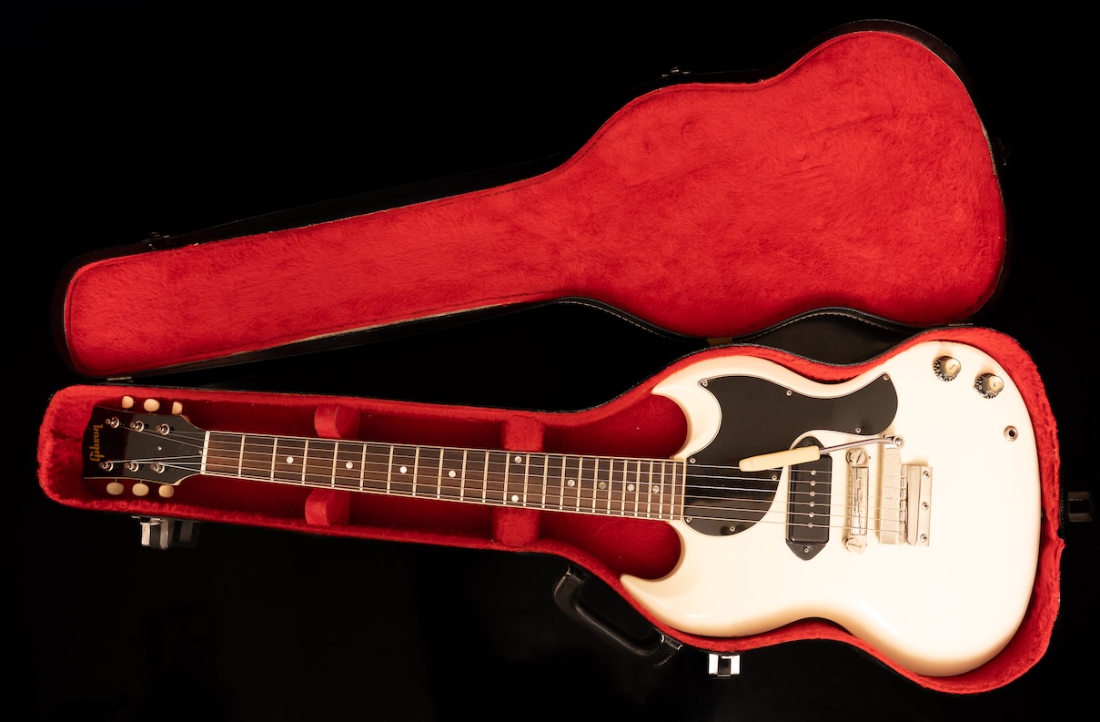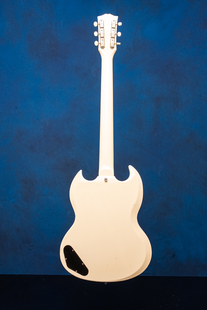 This near mint, custom color, 13-inch-wide SG Junior weighs just 6.40 lbs. and has a contoured solid mahogany body. One-piece mahogany neck with a nice, fat nut width of 1 11/16 inches, a standard Gibson scale length of 24 3/4 inches and a very fast thin to medium to thick profile. Brazilian rosewood fretboard with 22 original jumbo frets and inlaid pearl dot markers. Headstock with "Gibson" logo in gold and 'bell'shaped black plastic truss-rod cover secured by two screws. Closed-back Kluson Deluxe, 'double-line' strip tuners with white plastic oval buttons. Serial number "256226" stamped in blind on back of headstock. Single P-90 pickup in the bridge position with an outputs of 7.57k. Five-layer black over white plastic pickguard with eight screws. Two controls (one volume, one tone). Black plastic bell-shaped knobs with metal tops. The potentiometers are stamped "137 6502" (CTS, January 1965). Wrap-over pre-compensated, intonation adjustable, bridge/stud tailpiece. Nickel-plated hardware. This wonderful sixty-one year old SG Junior is in near mint (9.25) condition. Now lets be super critical: There are a few light check marks on the body, and a few almost invisible check marks on the back of the neck. There is one tiny mark on the back of the neck behind the 3rd fret and a red mark from the red case lining behind the 4th fret. There is one tiny surface chip (1/4 x 3/16 inch) on the back of the body just by the bass side contour and several small 'edge-chips', all of which have been touched-up many years ago. Complete with the original 24 page Gibson hang-tag with matching serial number, the original "Professionals Attention" hang-tag, a boxed set of Gibson hand made strings (lacking the high 'E') and the original (unused) Cadillac 'Bobby Lee No-Mishap' white leather guitar strap in the original box and instructions. Housed in the original shaped black softshell case with red plush lining (9.00). A stunning example of a rather rare bird.