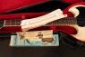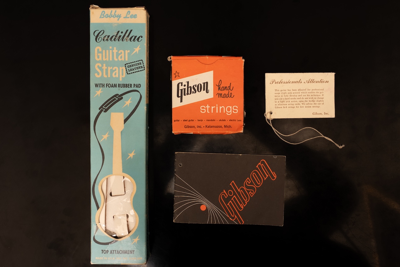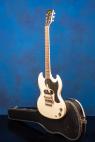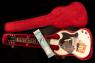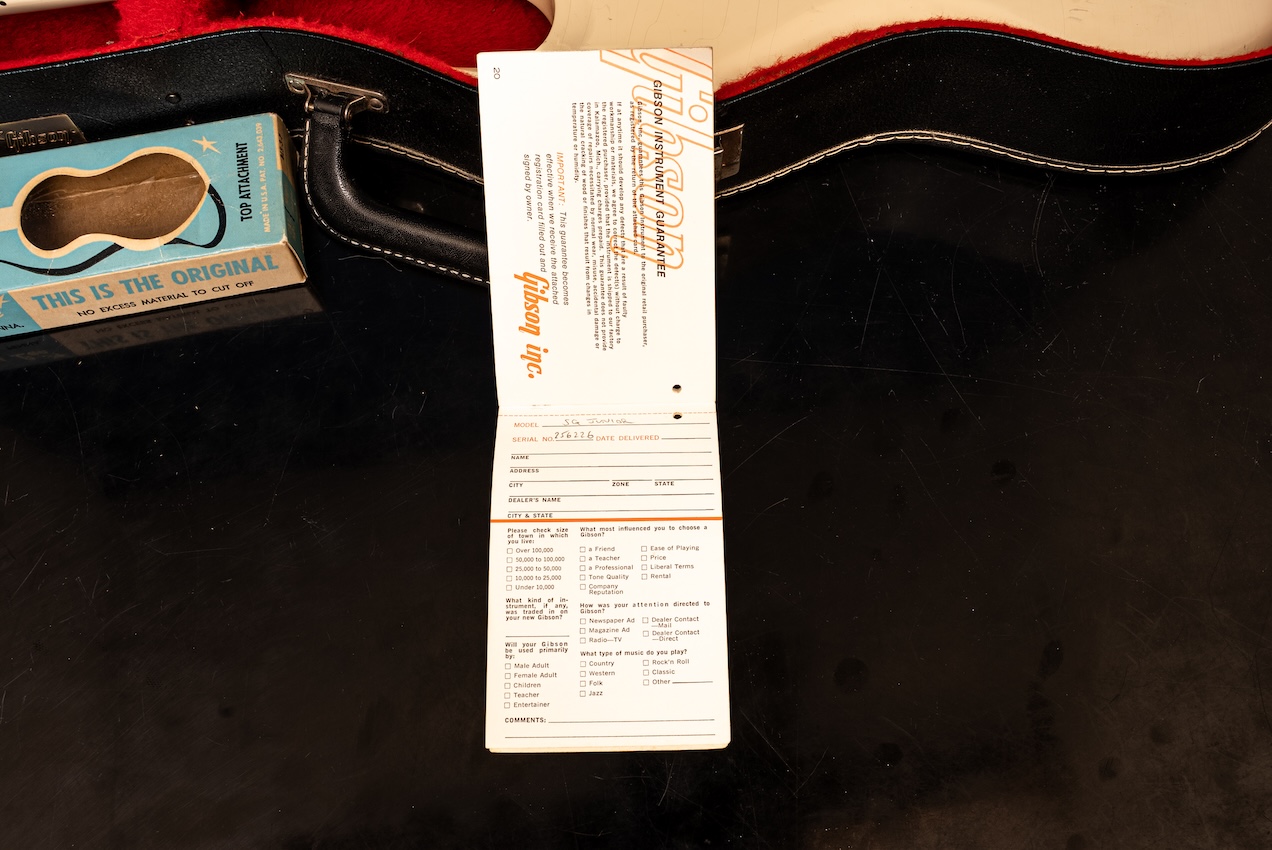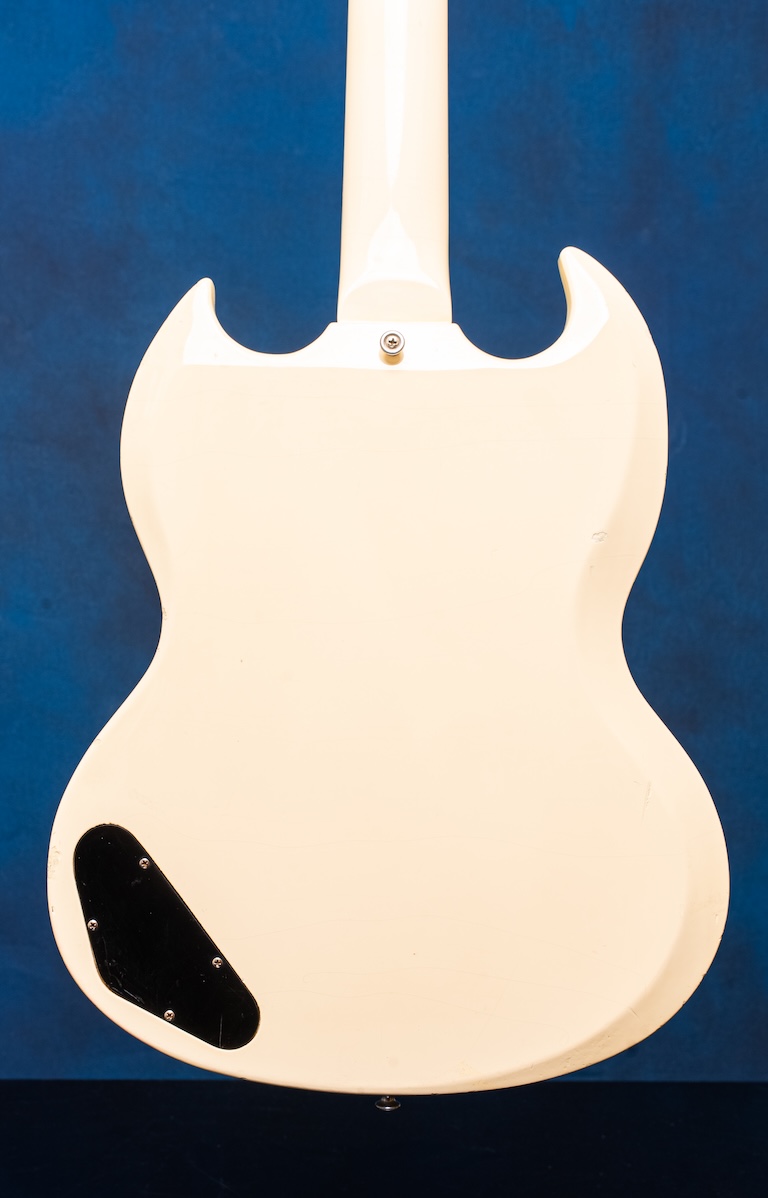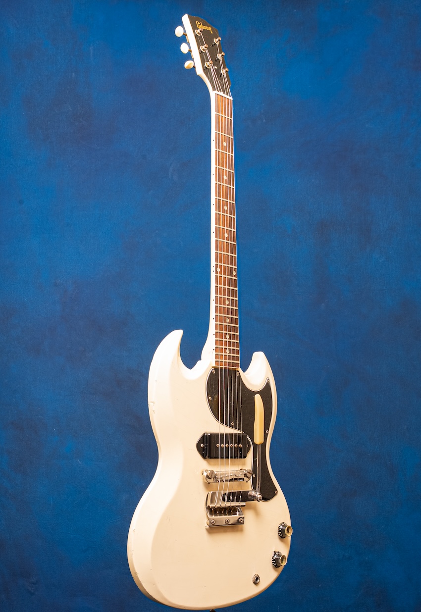 This near mint, custom color, 13-inch-wide SG Junior weighs just 6.40 lbs. and has a contoured solid mahogany body. One-piece mahogany neck with a nice, fat nut width of 1 11/16 inches, a standard Gibson scale length of 24 3/4 inches and a very fast thin to medium to thick profile. Brazilian rosewood fretboard with 22 original jumbo frets and inlaid pearl dot markers. Headstock with "Gibson" logo in gold and 'bell'shaped black plastic truss-rod cover secured by two screws. Closed-back Kluson Deluxe, 'double-line' strip tuners with white plastic oval buttons. Serial number "256226" stamped in blind on back of headstock. Single P-90 pickup in the bridge position with an outputs of 7.57k. Five-layer black over white plastic pickguard with eight screws. Two controls (one volume, one tone). Black plastic bell-shaped knobs with metal tops. The potentiometers are stamped "137 6502" (CTS, January 1965). Wrap-over pre-compensated, intonation adjustable, bridge/stud tailpiece. Nickel-plated hardware. This wonderful sixty-one year old SG Junior is in near mint (9.25) condition. Now lets be super critical: There are a few light check marks on the body, and a few almost invisible check marks on the back of the neck. There is one tiny mark on the back of the neck behind the 3rd fret and a red mark from the red case lining behind the 4th fret. There is one tiny surface chip (1/4 x 3/16 inch) on the back of the body just by the bass side contour and several small 'edge-chips', all of which have been touched-up many years ago. Complete with the original 24 page Gibson hang-tag with matching serial number, the original "Professionals Attention" hang-tag, a boxed set of Gibson hand made strings (lacking the high 'E') and the original (unused) Cadillac 'Bobby Lee No-Mishap' white leather guitar strap in the original box and instructions. Housed in the original shaped black softshell case with red plush lining (9.00). A stunning example of a rather rare bird.