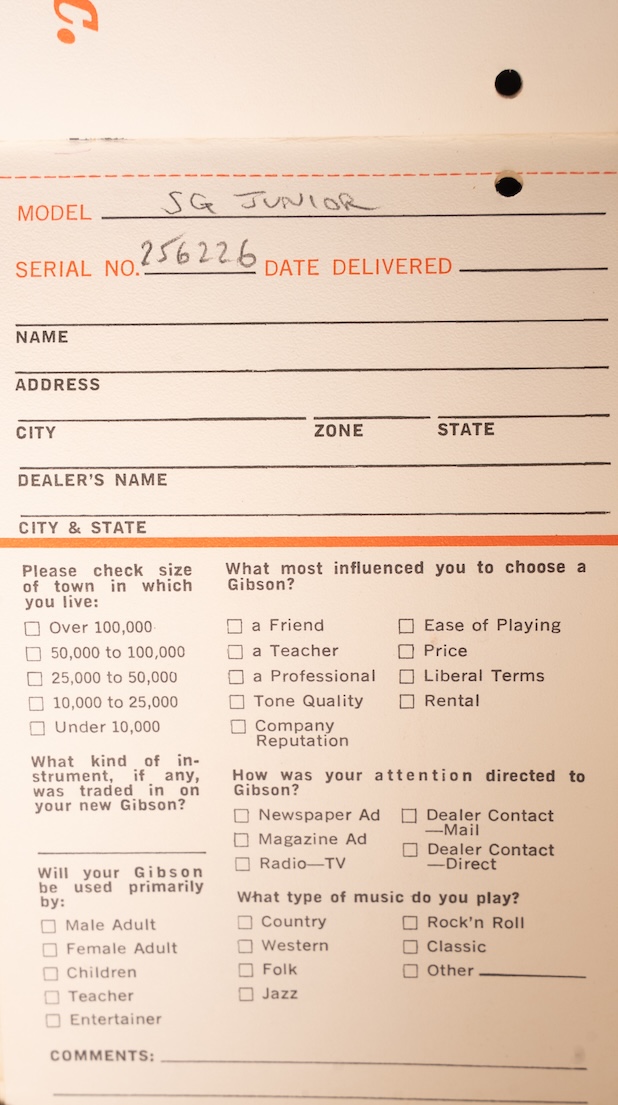 This is one of the last of the SG Juniors with the preferred 1 11/16 nut width. In mid '65, Gibson in their infinite wisdom, cut the nut width down by a full 1/8 inch to 1 9/16 inches - and then in 1966 they changed the peg-head angle from 17 degrees to 14 degrees. Sometime in 1968 they re-introduced the 1 11/16 inch nut width and in 1973 they reversed the peg-head angle change back to 14 degrees…