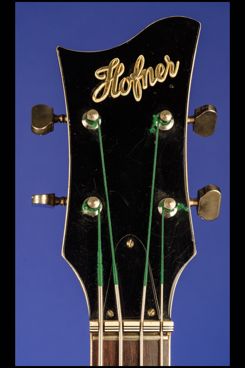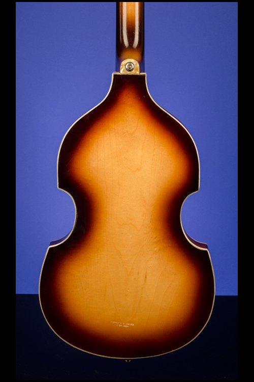 This near mint and original 1965/1966 Hofner 500/1 "Violin" bass weighs just 4.50 lbs and has a just over two-inch thick, eleven inch wide, 'violin' shaped full hollow-body. Arched one-piece spruce top, arched one-piece laminated 'flamed' maple back and triple-bound laminated maple sides. Two-piece flamed maple neck (similar to the bass that McCartney plays today) with a nut width of just over 1 9/16 inches and a comfortable medium-thick profile. Single-layer pearloid heel-cap with added strap button. Rosewood fretboard with a five-piece nut, a 'zero' fret and twenty-one original 'medium-thin' frets and mother-of-pearl dot position markers. (Replaced - period correct) individual open-back tuners with scalloped metal buttons. Black laminated headstock face with 'raised' Hofner script peghead logo in white plastic with gold face. Two Höfner Type 511 "Super" staple single-coil pickups with outputs of 4.36k and 4.51k. Two 'rotary' volume controls and three two-way 'slider' switches for "Rhythm/Solo", "Bass" and "Treble". Hofner 'teacup' control knobs with ribbed sides and metal tops, all on a 'thin' rectangular mother-of-pearl panel with black edging. 'Floating' four-saddle ebony bridge with ebony base with four 'friction-fit' moveable saddles. Hofner specific nickel 'trapeze' style tailpiece. Housed in a new four-latch, shaped black hardshell case with black plush lining (9.50). This guitar is a Spanish model from ca. 1965/66 with "Fabrica en Espana / A-20-01536" stamped in white on the back of the body. Inside the control panel, on the back of the body, written in black ink is "Jose Luis Precioso 50.827646."