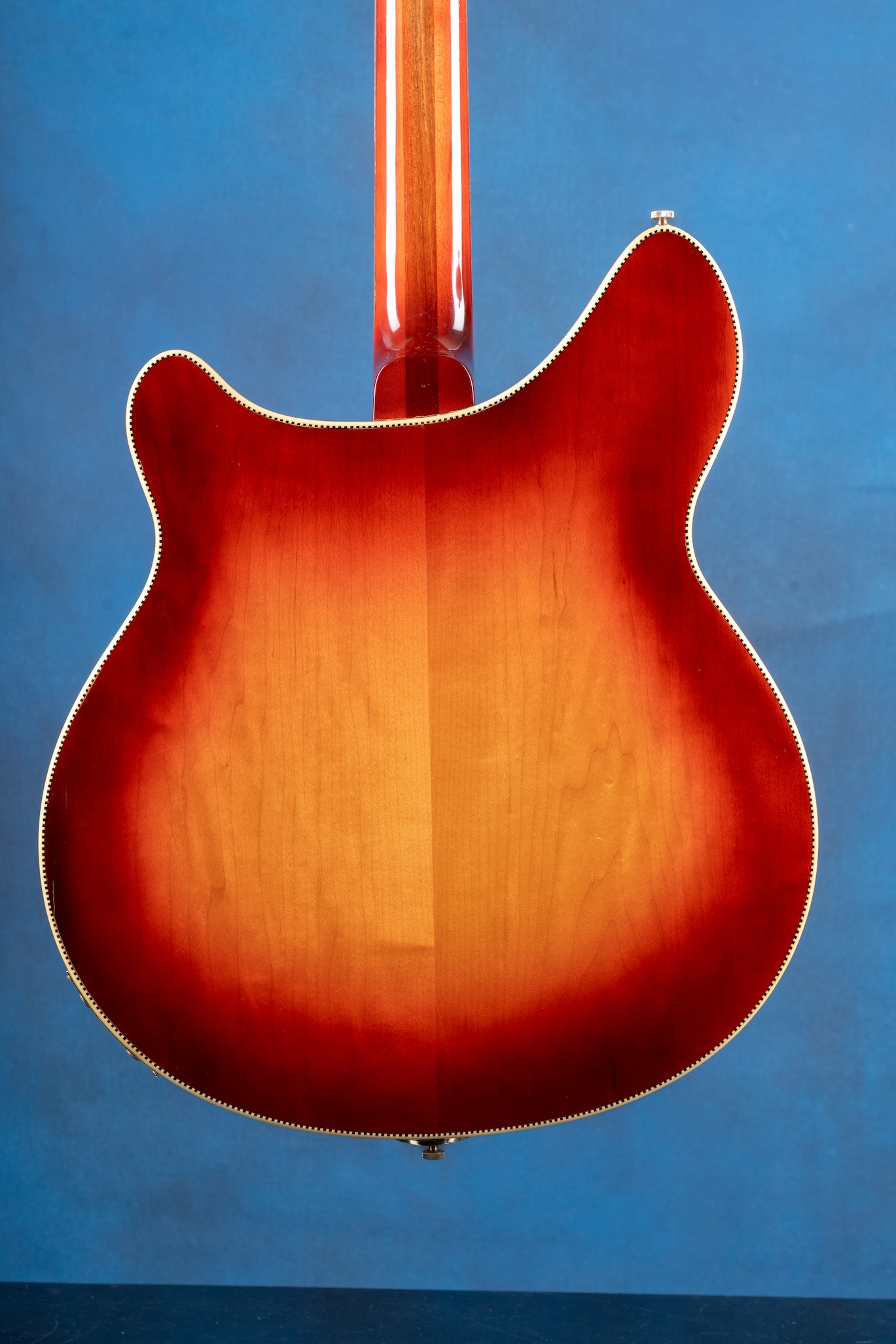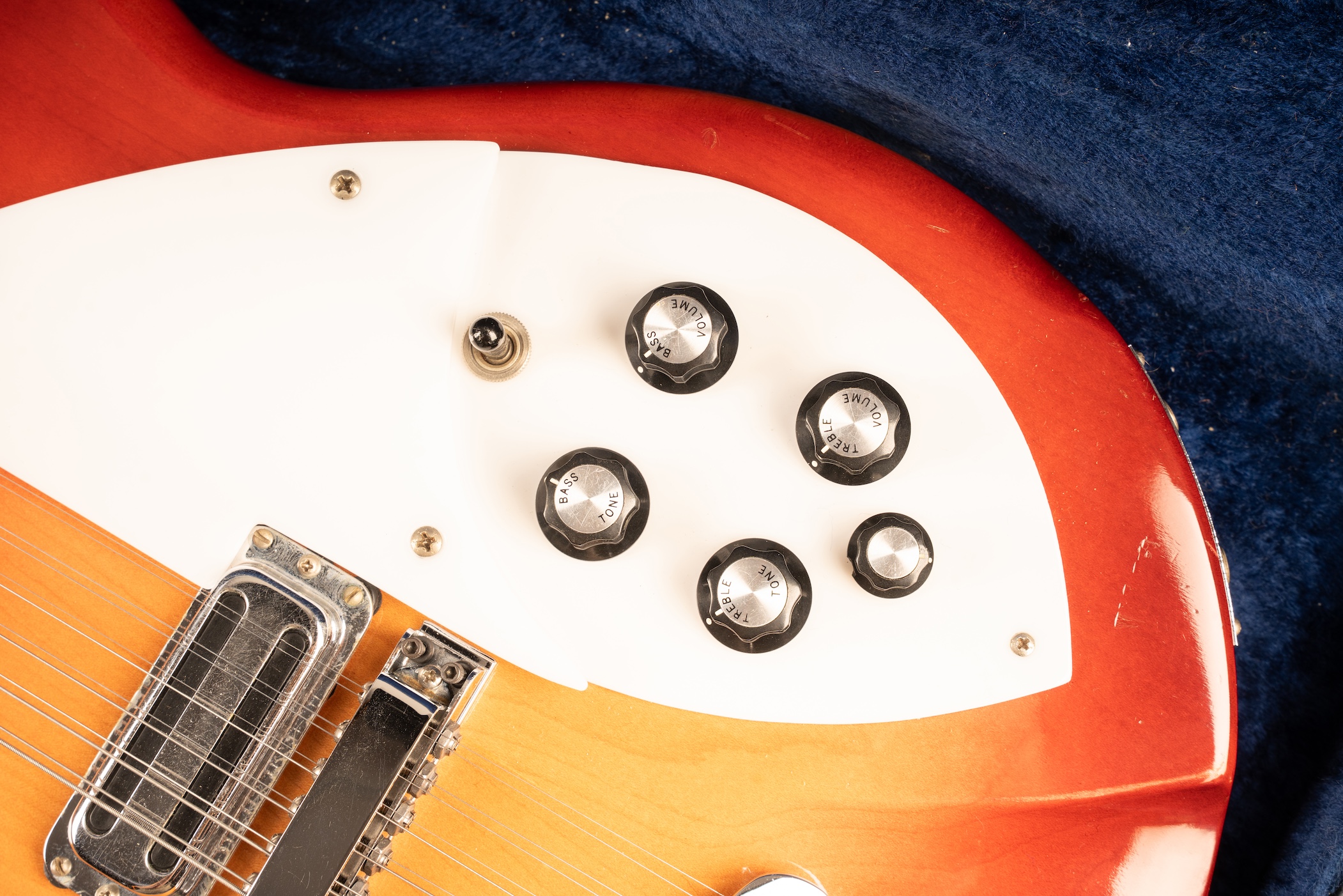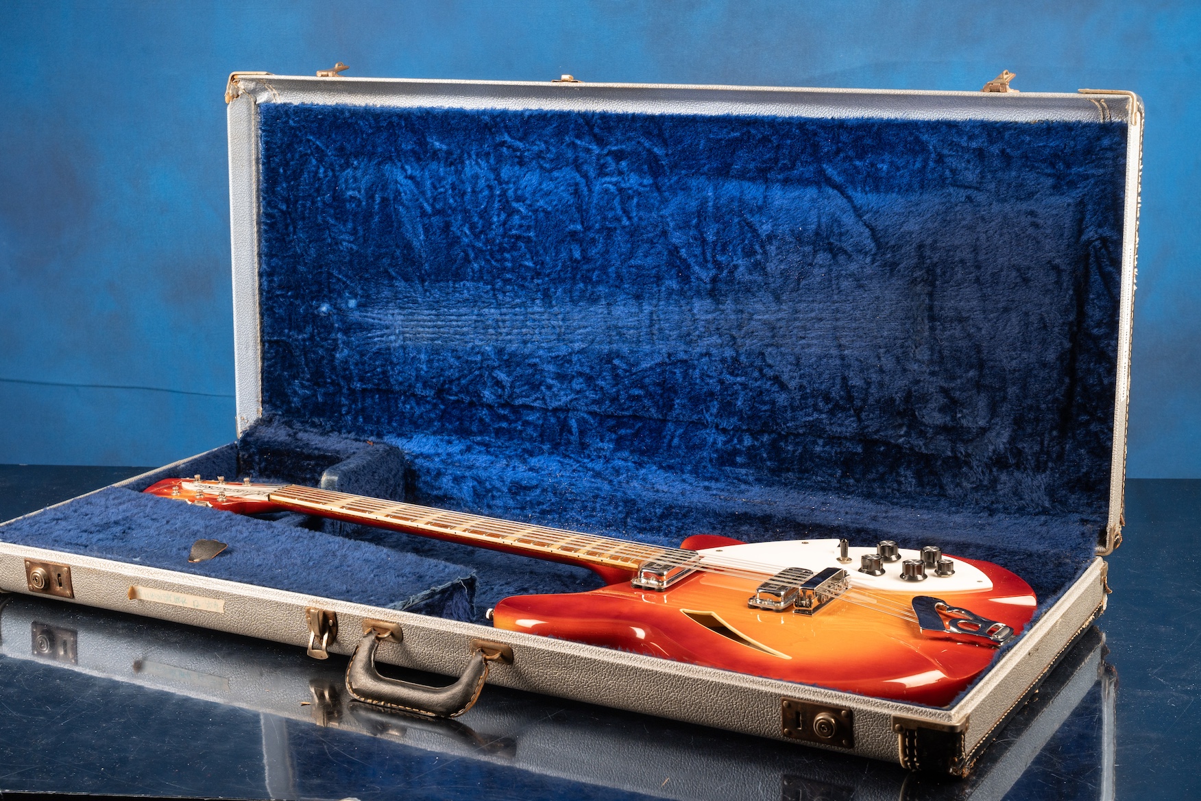 This 15-inch-wide thin-body (Just under 1 1/2 inches deep) semi-acoustic, full-size twelve string guitar weighs just 7.80 lbs. Hollow maple body with a single-bound "cat's-eye" or slash soundhole. The back of the body with 'checkerboard' binding. Three-piece glued-in maple/walnut/maple neck with a nut width of 1 5/8 inches, a scale length of 24 3/4 inches and a very comfortable medium-to-thick profile rising gently from 0.87 inch behind the third fret to 0.89 inch behind the 15th fret. Rosewood fretboard with 21 original medium-jumbo frets and triangular sparkle crushed pearl markers. Five-piece (maple/walnut) slotted headstock with white opaque plastic logo plate with black lettering. Twelve individual 'two-line' Kluson Deluxe tuners with oval metal buttons (all stamped "D-169400 / Patent No." on the underside). Two Rickenbacker chrome bar "toaster" pickups with chrome covers and outputs of 10.68k and 9.88k. Two-piece split-level white plastic pickguard with four screws. Five controls (two volume, two tone, and one blend control) plus three-way pickup selector switch, all on lower level of pickguard. Seven-sided black plastic knobs with metal tops with black lettering. The potentiometers are stamped "137 6608" (CTS February 1966). Rickenbacker bridge and Rickenbacker "R" tailpiece. The serial number "FE 1674" (May 1966) is stamped onto the jack plate which has two inputs, one "Standard" and the other [stereo] "Rick-O-Sound". This spectacular example is in near mint (9.25++) condition, the fireglo color being beautifully deep and unfaded. Complete with the original bridge cover. Housed in its original Rickenbacker rectangular silver hardshell case with black leather ends and blue plush lining (9.00).